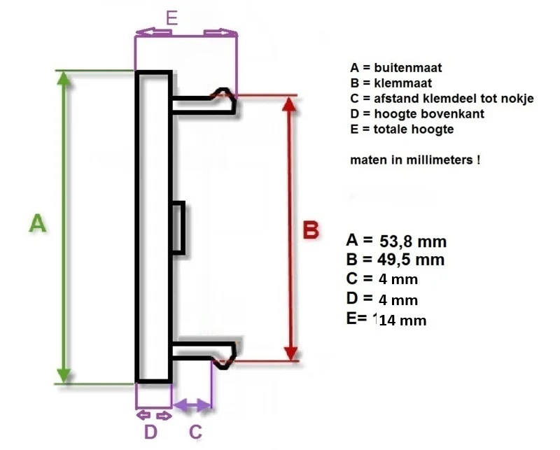 De bevestiging werkt heel eenvoudig want u hoeft deze naafdop alleen in de velg te klikken. Dit type is geschikt voor alle lichtmetalen velgen waarin een naafdop met de maat 53,8 mm past. De klemmaat bij de clipjes waarmee de naafdop in de velg wordt geklikt is 49,5 mm. Voor alle relevante afmetingen van deze naafdoppen zie de laatste afbeelding.
