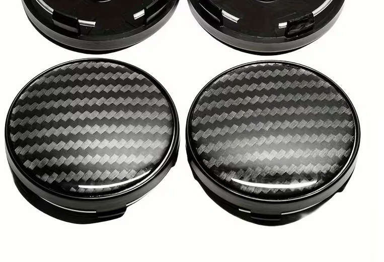 Artikelnummer: 159Set van vier naafdoppen van rondom zwart kunststof met opstaand randje en daarbinnen een prachtige afbeelding van carbonlook.