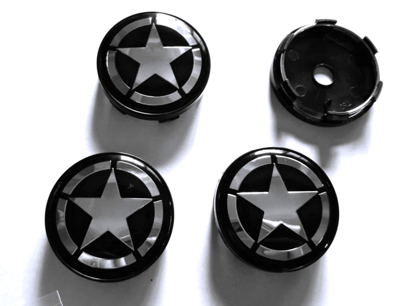 Set van 4 zwarte naafdoppen ster, buitenmaat 60 mm en klemmaat 56 mmSet van vier blanco naafdoppen van rondom zwart kunststof met opstaande randje en daarbinnen een prachtige afbeelding van een ster in zwart/zilverchroomkleur.
