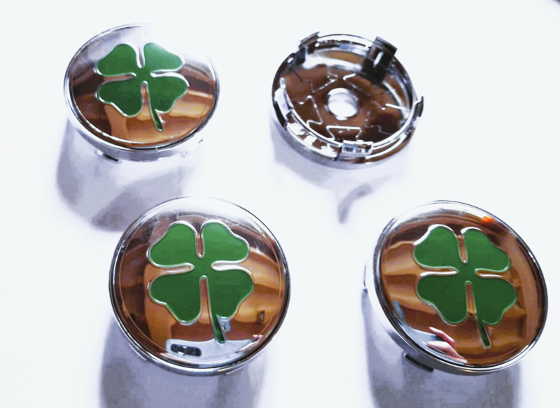 Set van 4 chroomkleurige naafdoppen klavertje 4, buitenmaat 60 mm en klemmaat 57 mmSet van vier naafdoppen van rondom chroomkleurig kunststof met opstaand randje en daarbinnen een prachtige afbeelding van Klavertje 4 groen op chroomkleur.