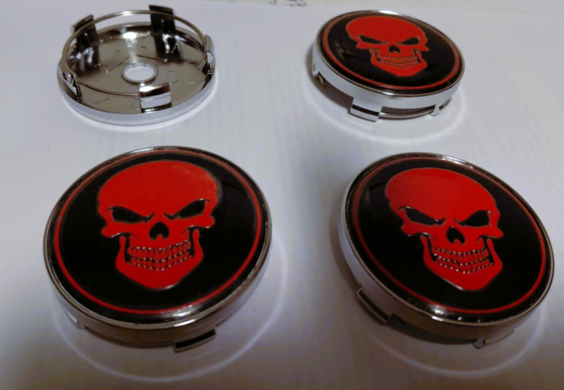 Set van 4 chroomkleurige naafdoppen rode skull, buitenmaat 60 mm en klemmaat 57 mmSet van vier naafdoppen van rondom chroomkleurig kunststof met opstaand randje en daarbinnen een prachtige afbeelding van een doodshoofd in zwart/rood.