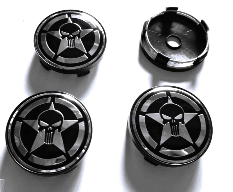 Set van 4 zwarte naafdoppen skull/star, buitenmaat 60 mm en klemmaat 57 mmSet van vier naafdoppen van rondom zwart kunststof met opstaand randje en daarbinnen een prachtige afbeelding van een skull/star in zwart/zilverchroomkleur.