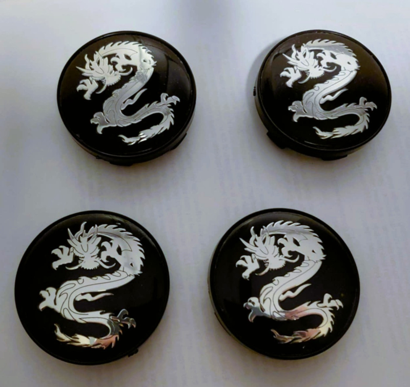 Set van 4 zwarte naafdoppen draak, buitenmaat 60 mm en klemmaat 56 mmSet van vier blanco naafdoppen van rondom zwart kunststof met opstaande randje en daarbinnen een prachtige afbeelding van een draak in zwart/zilverchroomkleur.